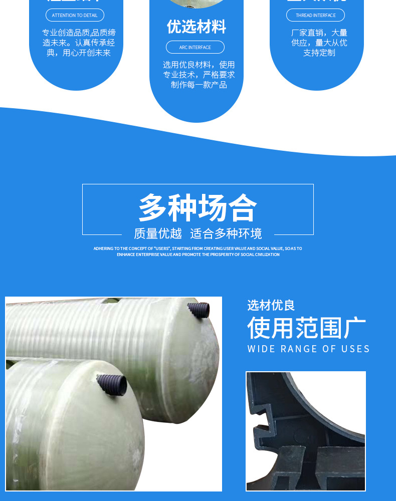 山東環(huán)通復(fù)合材料有限公司成立于2011年,是從事玻璃鋼產(chǎn)品的綜合性企業(yè)。產(chǎn)品分為:玻璃鋼儲(chǔ)罐容器,玻璃鋼環(huán)保設(shè)備,玻璃鋼污水處理設(shè)備,玻璃鋼水產(chǎn)養(yǎng)殖設(shè)備,玻璃鋼防腐保溫工程,玻璃鋼冷卻塔,玻璃鋼管道,八大系列(玻璃鋼加砂管道,玻璃鋼化糞池,玻璃鋼脫硫塔,玻璃鋼格柵,玻璃鋼防腐,玻璃鋼儲(chǔ)罐,玻璃鋼管件等)。